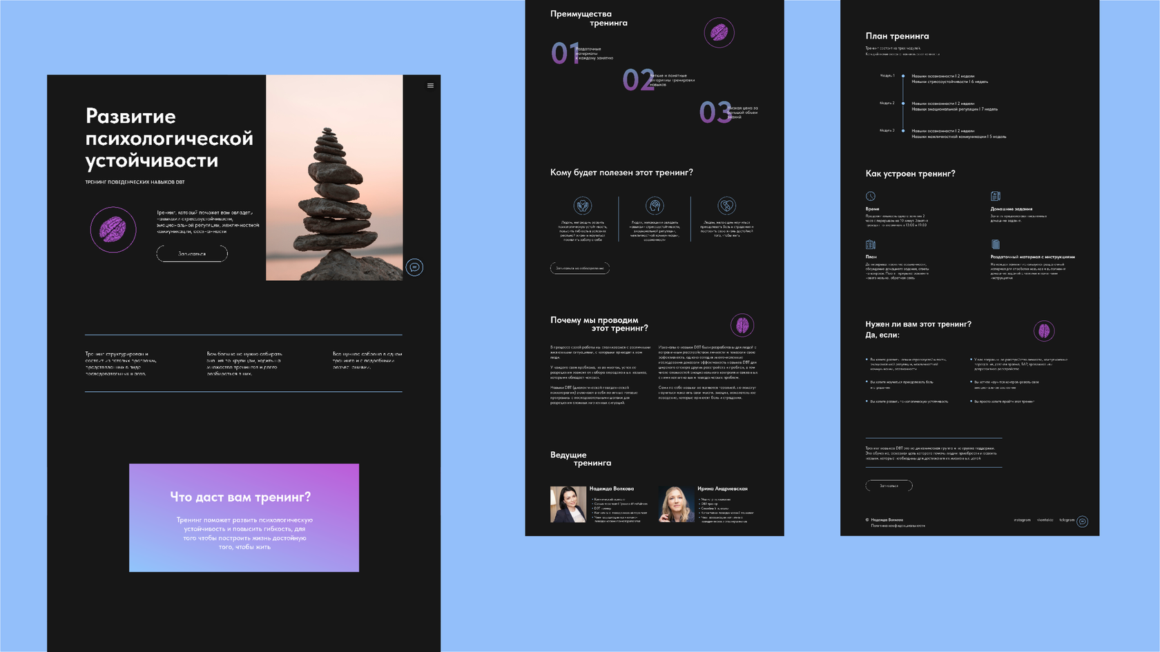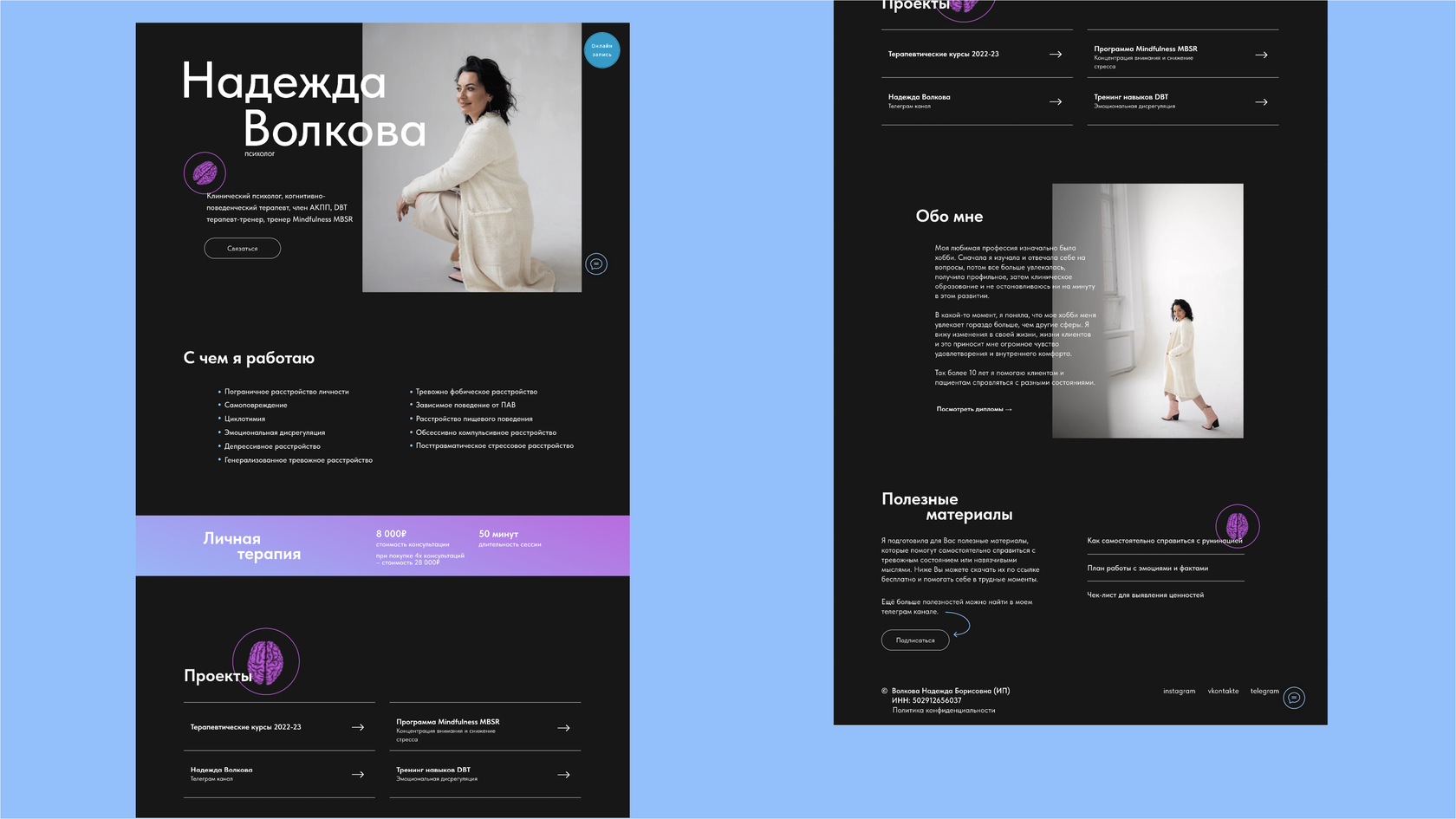 Nadezhda is a highly qualified psychologist. I have developed a website that introduces visitors to the specialist and allows them to schedule appointments online, as well as additional pages that provide information about group sessions.
