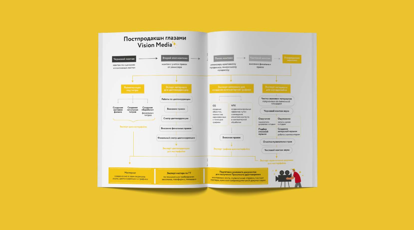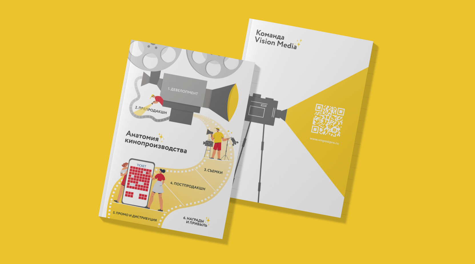 Vision Media is a full-cycle post-production studio. For their clients, they wanted to create notebooks that outline the stages of filmmaking, the company's workflow process, a list of international film festivals, and recommendations for movies and series.